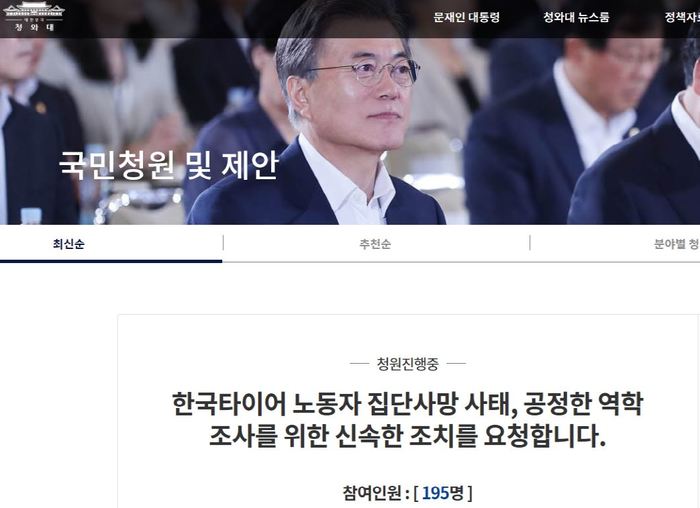 한국타이어 산재협의회는 한국타이어 노동자 집단사망 사태와 관련, "한국타이어 노동자 160여명 사망사건에는 모르쇠로 일관하기에 공정한 역학조사를 위한 신속한 조치를 요청하는 청와대 국민청원이 제기했다"고 발표했다.