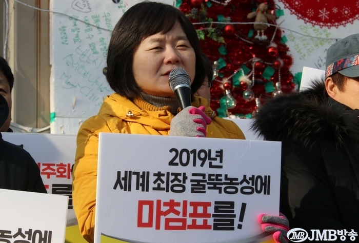 해가 바뀌어도 내려오지 못하고 있다며, 정의당은 또 다른 다짐을 하기 위해 이 자리에 함께 했다. 먼저 1년이 넘도록 극한농성을 하며 싸우고 있는 홍기탁, 박준호 두 동지의 건강을 기원하며,. 하루 빨리 내려올 수 있도록 최선을 다하겠다는 약속을 드린다면서 그리고 23일째 단식을 이어가고 있는 차광호 동지 그리고 우리 박래군 선생님을 비롯해서 박승렬 목사님, 나승구 신부님 이 추운 겨울에 밥을 굶는다는게 얼마나 힘든 일인지 잘 알고 있기에 하루 속히 단식을 풀 수 있도록 최선을 다하겠다. 약속했다.