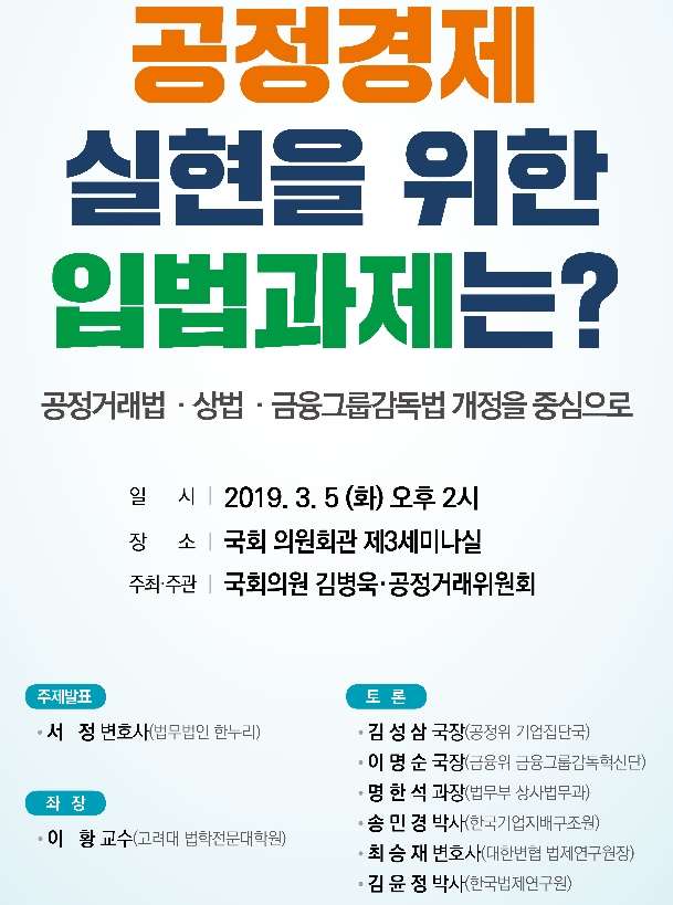이날 토론회 주제발표는 법무법인 한누리 서정 변호사가 맡았으며, 토론으로는 공정거래위원회 기업집단국 김성삼 국장, 금융위원회 금융그룹감독혁신단 이명순 국장, 법무부 상사법무과 명한석 과장과 대한상의에서 추천을 받은 대한변협 법제연구원 최승재 변호사, 기업지배구조연구원의 송민경 박사, 한국법제연구원의 김윤정 박사, 좌장은 고려대 법학전문대학원 이황교수가 맡았다.