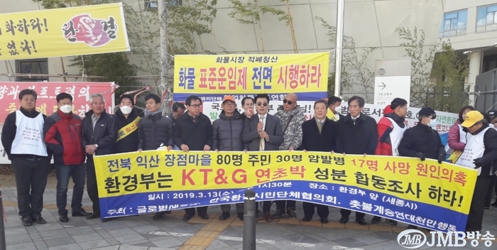 [jmb방송=김은해 기자]13일 오후 세종시 환경부 청사 앞에서 환경단체 글로벌에코넷(상임회장 감선홍), 한국환경시민단체협의회(이하 환민협 회장 김진관), 촛불계승연대천만행동(상임대표 송운학) 등 시민단체들이 환경부는 KT&G 연초박 사업장폐기물계약서가 국가기밀이냐 국민생명권, 건강권, 그리고 알 권리가 더욱 중요하다며 환경부가 직접나서 전북 익산 장점마을 (일명 암마을)에서 주민 80여 명 중 30여 명이 암에 걸려 17명이 사망하는 희대의 사망사건 직접적 원인의혹 규명 촉구에 나섰다.