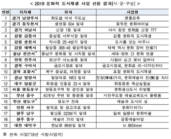 이번에 선정된 문화적 도시재생 사업지에는 1곳당 3억 원 내외의 국비를 지원(지방비 별도)하고, 사업 전 과정에 걸쳐 관련 전문가의 맞춤형 컨설팅과 대상지역 간 교류 기회를 제공한다.