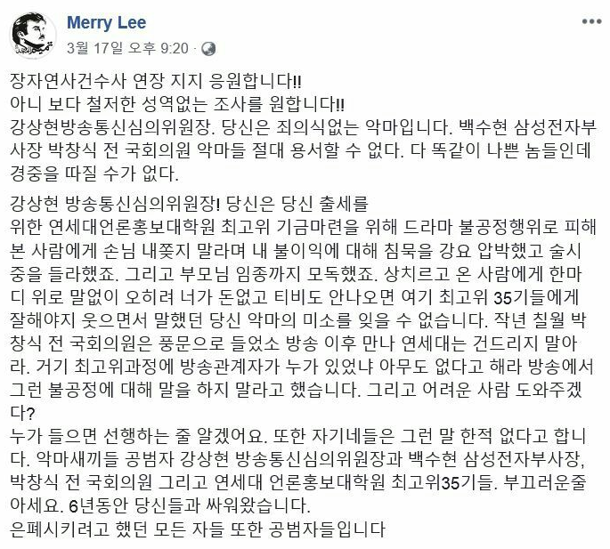 한편 촛불계승연대는 특별성명에서 “오늘 ‘이슈앤뉴스’ 박응식 기자가 양심선언을 통해 생생하게 구체적으로 증언한 언론농단의혹을 삼성이 즉각 해명할 것을 요구”했다.