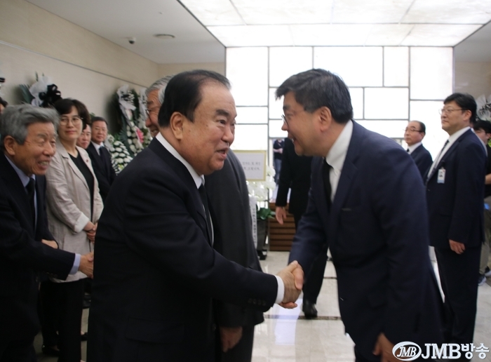 ▲ 19일 오후 조문객을 마나 이야기 하는 문희상 국회의장 © jmb방송 김은해 기자