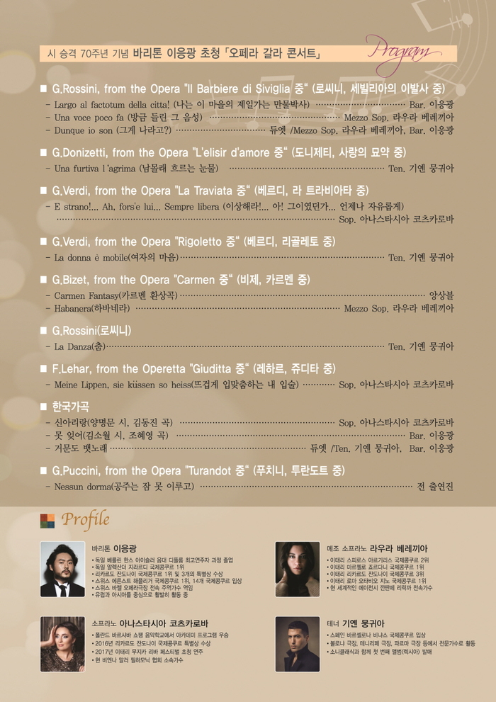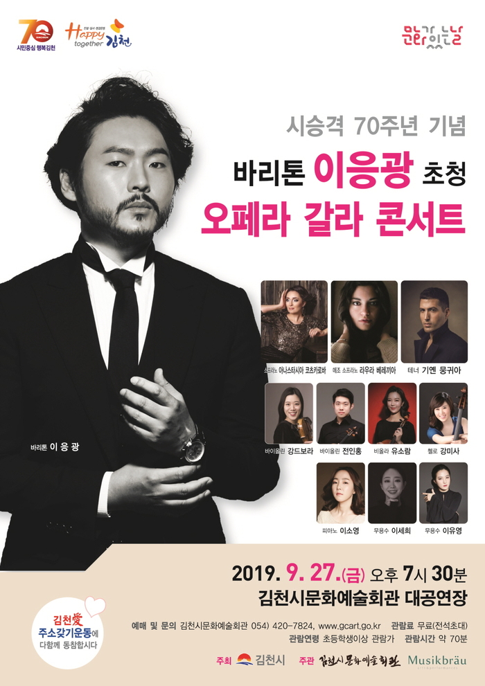 【jmb방송 = 송창식 기자】 김천시문화예술회관(관장 김금숙)에서는 시 승격 70주년을 기념하여 바리톤 이응광 초청 기획공연 ‘오페라 갈라 콘스트 ’를 오는 9월 27일 오후 7시 30분 김천시문화예술회관 대공연장에서 개최한다. 이날 공연은 총 4인의 성악가와 5인의 연주자 및 2인의 무용수가 함께 펼쳐지는 오페라 갈라 콘서트로 김천에서 나고 자라 월드스타로 자리매김한 바리톤 이응과 유럽의 신성 음악가들을 함께 초청하여 오페라 아리아 무대를 선사한다. 바리톤에 이응광과 유럽의 신성 음악가들을 함께 초청하여 오페라 아리아 무대를 선사한다.바리톤에 이응광, 메조소프라에 라우라 베레끼아, 소프라노에 아나스 타시아 코츠카로바, 테너에 기옌 뭉귀아가 출연하며 피아노 5중주 연주와 무용숭의 춤으로 완성도 있는 무대를 연출한다.