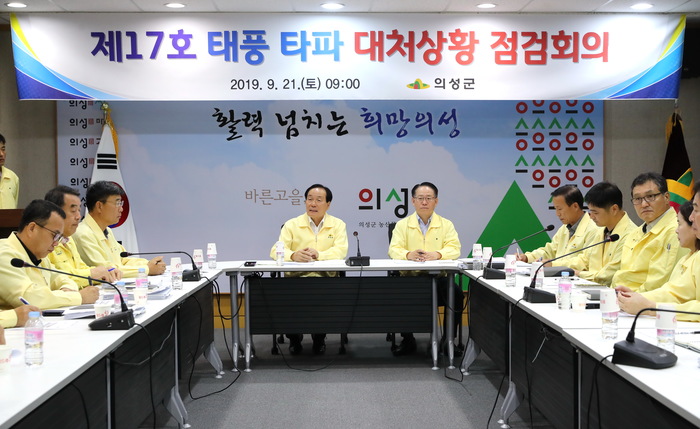 【송창식 기자】 의성군은 9월 21일 오전 9시, 영상회의실에서 국장과 각 관 · 과 ·소장이 함께한 제 17호 태풍 ‘타파 ’ 북상에 따른 긴급회의를 개최했다.