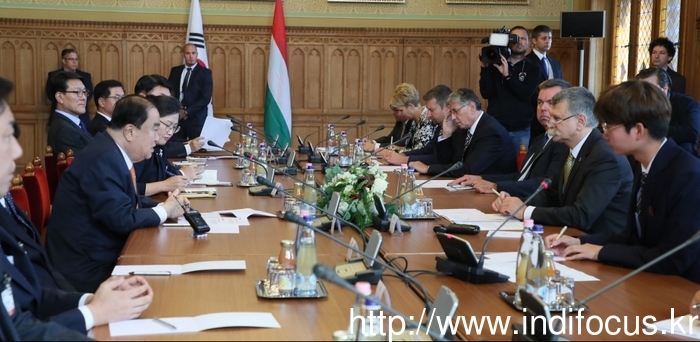 [임명식 기자]헝가리를 공식방문 중인 문희상 국회의장은 현지시간 20일(금) 오후 수도 부다페스트에 위치한 헝가리 국회의사당에서 라슬로 꾀비르(László Kövér) 국회의장을 만나 양국 간 교류확대 및 경제협력 증진방안에 대해 의견을 나누고 공동기자회견을 가졌다.