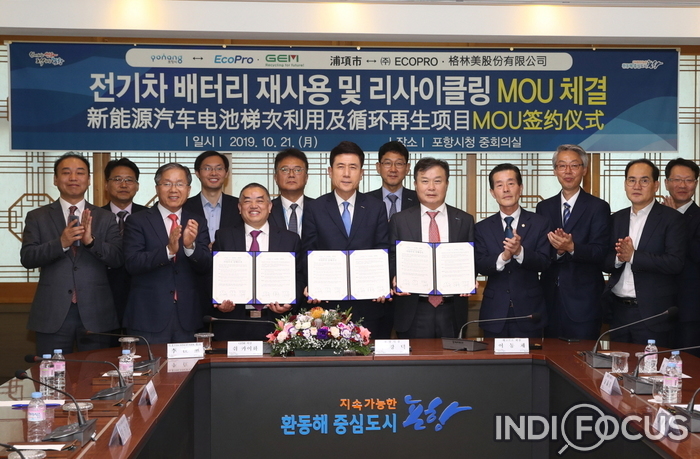 【인디포커스/송창식 기자 】 포항시는 21일 국내 대표 리튬이차전지 생산기업인 (주)에코프로 및 중국 GEM사와 전기차 배터리 재활용 및 리사이클 사업과 관련한 투자 양해각서 (MOU)를 체결했다.