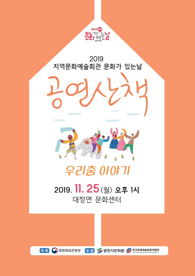 이번 공연은 문화체육관광부가 주최하고 한국문화예술회관연합회가 주관하는 「문화가 있는 날 -공연산책 」사업에 선정되어 지난 5월부터 지역의 다양한 장소에서 시민들과 소통하며 진행되었고 매월 마지막 주마다 지역의 다양한 장소를 공연문화공간으로 만들었던 지난 7개월간의 대장정은 ‘우리 춤 이야기 ’로 대참면에서 마지막 대미를 장식할 예정이다.