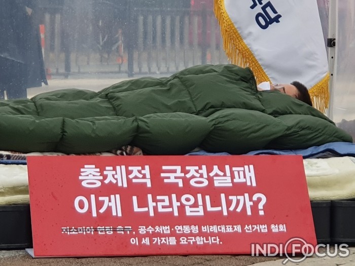같은 당 권성동 의원은 "정권이 공수처 설치를 고집하는 이유는 문재인 대통령에게 반대하는 한국당 의원과 보수 애국 시민을 모두 제거하고 독재의 길로 가기 위한 것"이라며 "그래서 황 대표가 목숨 걸고 투쟁하는 것"이라고 주장했다.