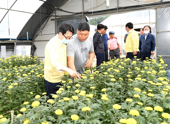▲ 최종환 파주시장 화훼농가 현장방문 농업인이 현장에서 겪는 어려움을 청취하고 있다./파주시 제공 © 인디포커스