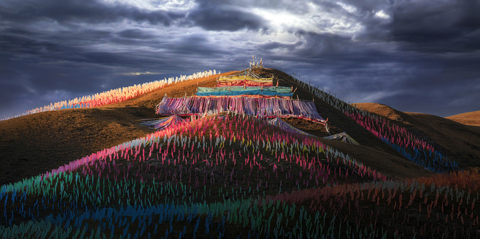 ‘옴마니밧메훔’ 여섯 글자에는 티베트 사람들의 우주관과 윤회관이 그래도 들어있다. 그들에게 주어진 운명의 천상계, 아수라계, 인간계, 축생계, 지옥계의 여섯 세계를 돌고 도는 윤회의 수레바퀴를 따르는 것인데 이 끝없는 윤회의 숙명에서 벗어나 열반의 니르바나에 이르기 위해 온 몸을 던져 해탈을 구하는 것이다. 생활이 되어버린 신앙은 칼바람에 찢긴 타루초처럼 처절하다. 그 혹독한 고행의 길에 선 사람은 세상의 언어로는 위로받을 수 없음이라. 다만 길 위로 스쳐간 바람 소리에서 산의 음성을 듣는다.