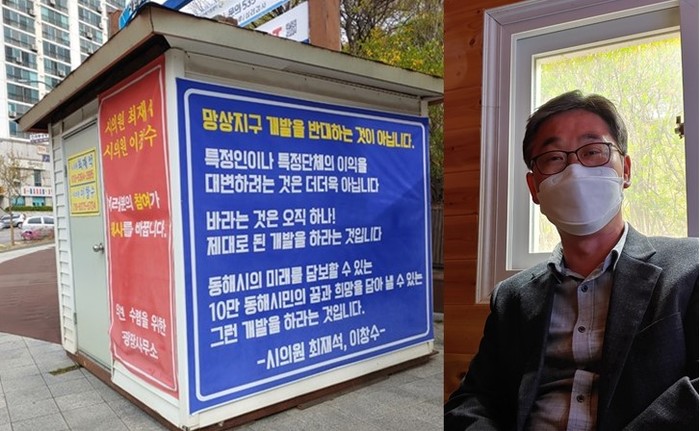 다섯 번째 순서로 사업에 대해 의혹을 제기하면서 1인 시위는 물론 기자회견 등을 통해 반대하는 측의 목소리를 내고 있는 동해시의회 이창수 의원이다.
