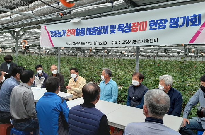 평가회에서는 농업기술센터에서 보급한 ‘뿌리이리응애’(총채벌레 번데기 천적)를 활용한 총채벌레의 방제 효과와 시에서 육성한 장미품종에 대한 품평이 진행됐다.