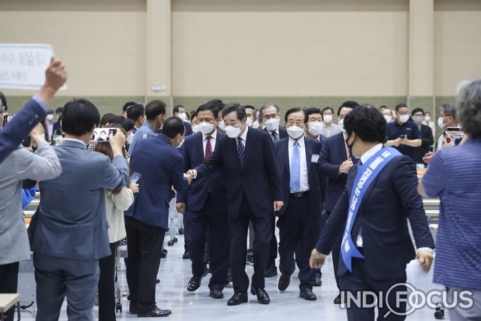 29일 전라남도 순천만 생태문화교육원에서 2만5천여명이 넘는 지역 주요 인사들이 발기인으로 참여한 창립총회 참석을 ‘이낙연 전 대표가 지역민들과 악수를 하며 행사ㄷ장으로 들어가고 있다.© 인디포커스 사진제공/이낙연 캠프