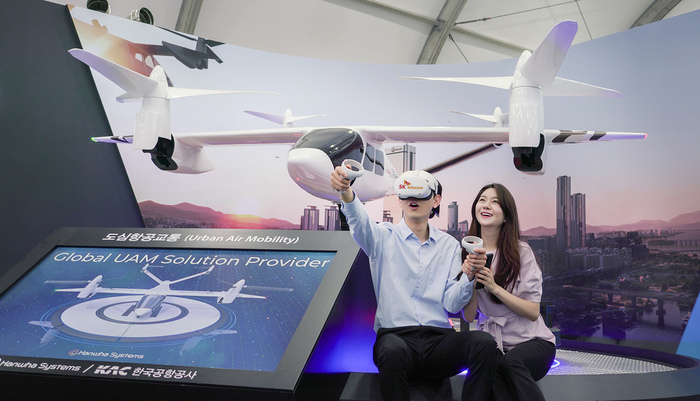 한화시스템은 최대시속 320km/h로 안전하고 빠르게 비행하는 에어 모빌리티 기체 ‘버터플라이’ 실물모형을 전시하고, UAM 체험을 위한 기체 내부 시뮬레이터를 마련했다.