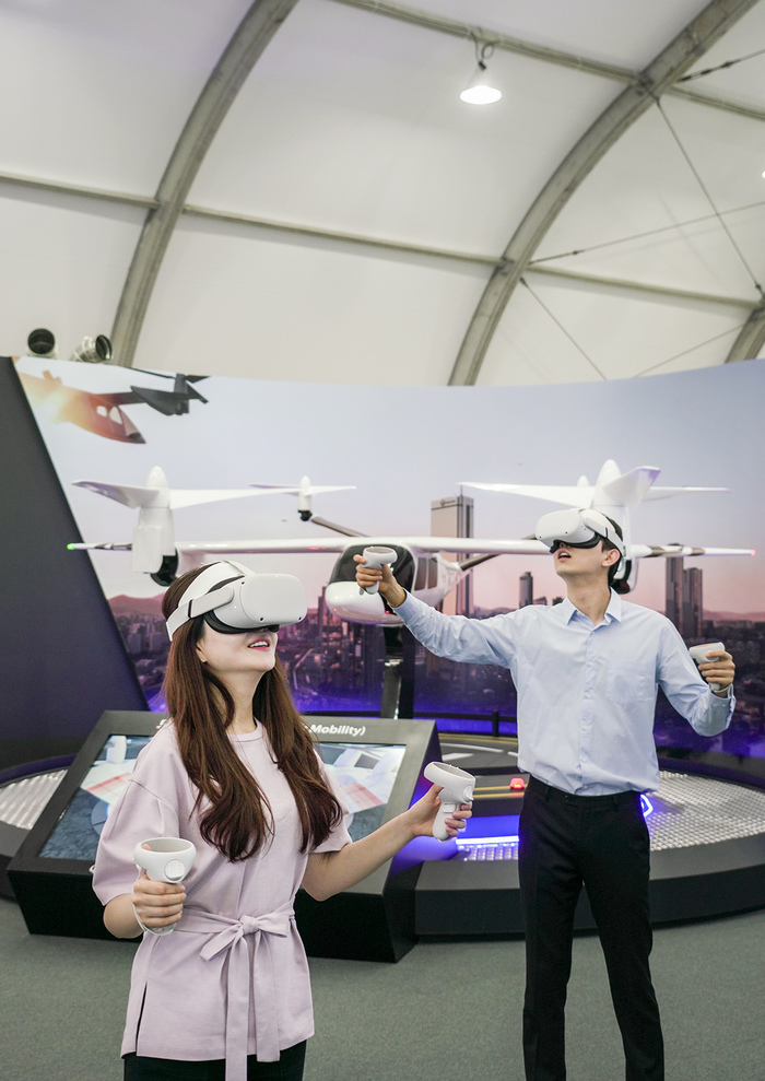 SKT와 티맵모빌리티는 UAM 서비스 품질을 결정할 빠르고 편리한 예약 프로세스 및 탑승과 관련된 가상 탑승체험 코너를 준비했다. 스마트폰을 통해 티맵모빌리티의 서비스 플랫폼에 접속한 뒤 경로를 검색하면 지상교통과 UAM으로 이동할 때의 소요시간을 비교해 준다. 이후 얼굴인식 등 간편한 방식의 사용자 인증을 통해 예약 및 탑승 수속까지 마치면, 시뮬레이터에 올라 UAM을 타고 서울 상공을 비행하는 VR 영상을 감상할 수 있다.