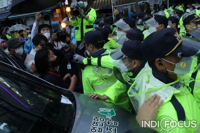 【인디포커스/김한솔 기자】 3일 오후 민주노총이 여의도에서 열릴 예정이었던 전국노동자대회가 원천 봉쇄되자 종로3가로 자리를 옮겨 기습적으로 노동자대회를 열었다. 이 날 민주노총은 전국노동자대회를 마치고 종로4까, 을지로4가를 거쳐 서울시청 앞으로 행진예정이었으나 경찰은 집시법 위반과 코로나바이러스 감염증(코로나 19) 예방 차원에서 행진을 막았다.