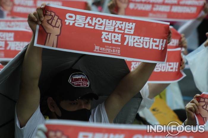 【인디포커스/김한솔 기자】 3일 오후 민주노총이 여의도에서 열릴 예정이었던 전국노동자대회가 원천 봉쇄되자 종로3가로 자리를 옮겨 기습적으로 노동자대회를 열었다. 이 날 민주노총은 노동법 전면 개정 등을 요구했다. 특히 마트산업노동조합은 11월 총파업은 예고하고 있다.