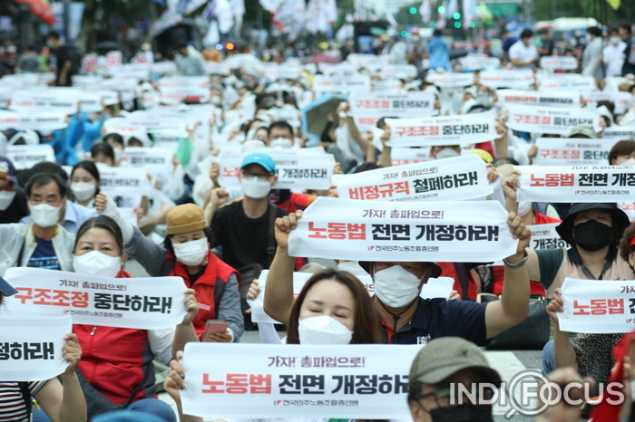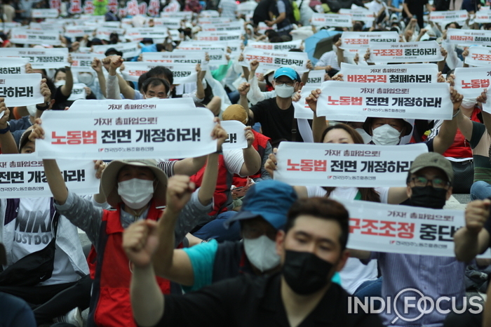 【인디포커스/김한솔 기자】 3일 오후 민주노총이 여의도에서 열릴 예정이었던 전국노동자대회가 원천 봉쇄되자 종로3가로 자리를 옮겨 기습적으로 노동자대회를 열었다. 이 날 민주노총은 노동법 전면 개정 등을 요구했다.