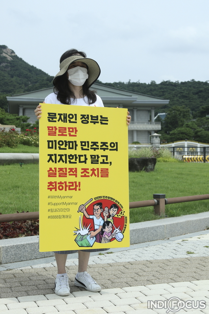 이날 ‘미얀마 민주항쟁에 연대하는 8888 공동행동’은 코로나바이러스감염증-19(COVID-19)로 방역차원에서 집회없이 청와대를 비롯하여 광화문광장, 미얀마 대사관, 미얀마 관저 등 미얀마 관련 장소에서 1인 시위를 벌였다.