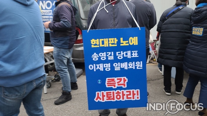 16일 여의도 민주당사앞에서 일부 민주당원들은 즉각 사퇴하라 는 팻말을 목에걸었다. © 인디포커스 사진/김은해