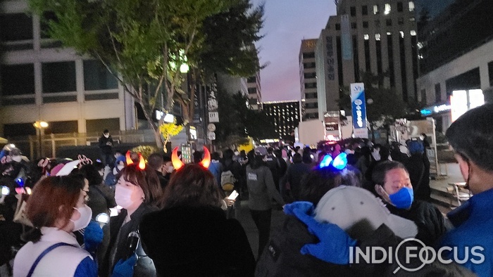 16일 오후 여의도 민주당사 앞으로 몰려든 일부 민주당원들은 뿔 머리띄를 쓰고 민주당에 화났다는 의사표현을 하고 있다.© 인디포커스