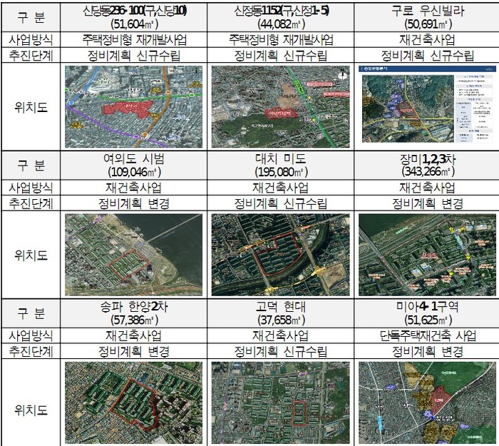 서울시는 이번에 밝힌 ▴신당동 236-100일대(주택정비형 재개발) ▴신정동 1152일대(주택정비형 재개발) ▴구로 우신빌라(재건축) ▴여의도 시범(재건축) ▴대치 미도(재건축) ▴송파 장미1‧2‧3차(재건축) ▴송파 한양2차(재건축) ▴고덕 현대(재건축) ▴미아 4-1(단독주택재건축) 9개 지역은 정비사업의 속도를 높이면서 공공성과 사업성을 동시에 담보할 수 있을 것으로 기대했다.