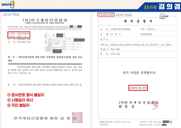 또 이 협회 김영만 회장의 이름을 기재하는 방법도 김건희 씨 문서에는 “(사)한국게임산업협회 회장 김영만”으로 (사)라는 기호를 표시하고 두 줄로 쓰여진 반면에, 문체부 공식 문서는 (사) 표시 없이 한 줄로 기재하는 방식이었다.