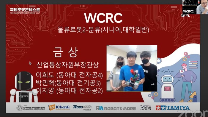 전자공학과 학생들은 앞서 펼쳐진 ‘2021 WCRC 3차 본선(2021 국제로봇 콘테스트)’에서도 ‘물류로봇2-분류 시니어/대학일반통합’ 부문(이희도·박민혁·이지양)과 ‘물류로봇1-이동 시니어/대학일반통합’ 부문(김광영·박민혁·이희도)에서 각각 산업통상자원부장관상과 한국로봇교육콘텐츠협회장상을 차지했다.