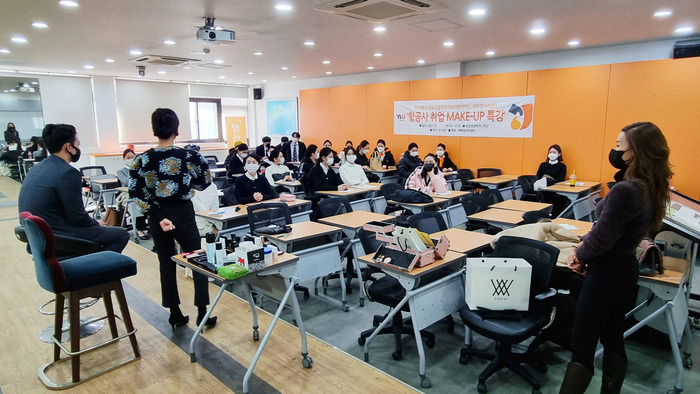서씨는 이날 학생들을 대상으로 ▲항공승무원 채용 면접을 위해 자신에게 어울리는 셀프 메이크업 ▲피부기초 관리법 ▲메이크업 이론과 실제 ▲자신의 피부에 맞는 파운데이션 컬러 선정 및 색조 화장 컬러 진단하기 등의 내용을 강연했다.