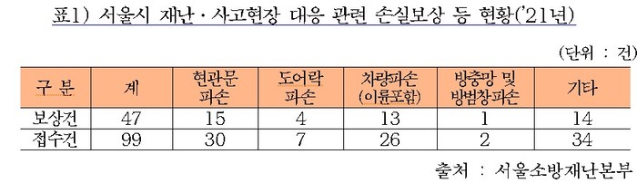 소방활동으로 인한 차량이나 현관문 파손 등으로 시 소방재난본부가 접수한 2021년 피해사례는 총 99건이었다. 이 중 ‘서울특별시 소방활동 손실보상에 관한 조례’에 따라 심의를 거쳐 보상이 완료된 사례는 47건으로 금액은 8천 1백여 만원이다.