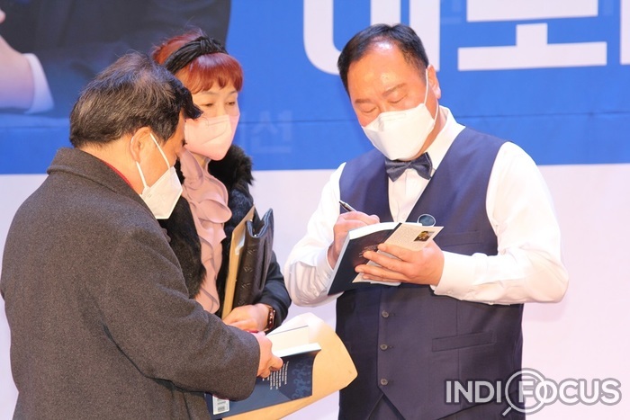▲ 26일 김인호 의장이 백주년기념관 홀에서 열린 출판기념회에서 지인에게 사인을 하고 있다.사진/서울시의회기자단공동취재 ©인디포커스