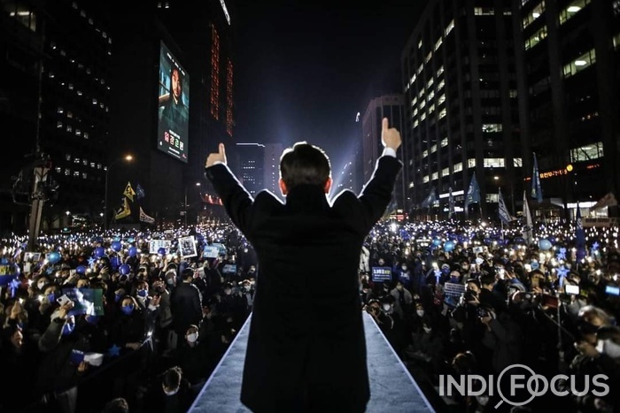 [인디포커스/김은해]20대 대통령선거 유세 마지막 서울 청계광장은 초저녁부터 사람들이 모여 차량이 인파에 갇히는 등 5년 전 촛불이 바다가 되었던 것처럼 많은 사람이 모여들었다.