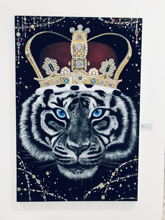 배우이자 화가인 김규리 씨는 ”호랑이는 지켜준다(수호)라는 의미가 있다“며 ”(호랑이)작품 제목 <산군>은 팬들이 지어준 이름이다 작품 속 호랑이의 파란 눈동자는 다양한 각도에서도 눈을 마주할 수 있다“고 말했다.