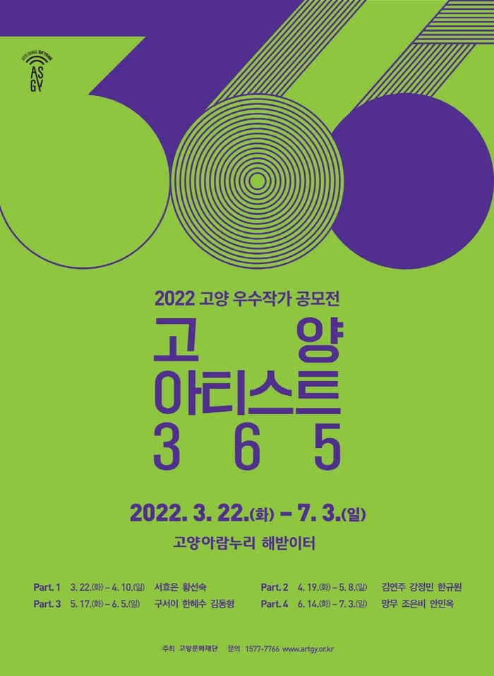 「2022 고양아티스트 365」 릴레이 개인전 일정은 Part 1 [ 3. 22. (화) ∼ 4. 10. (일), 서효은, 황선숙 작가 ], Part 2 [ 4. 19. (화) ~ 5. 8. (일), 김연주, 강정민, 한규원 작가 ], Part 3 [ 5. 17. (화) ~ 6. 5. (일), 구서이, 한혜수, 김동형 작가 ], Part 4 [ 6. 14. (화) ~ 7. 3. (일), 망무, 조은비, 안민옥 작가 ]이며, 관람시간은 오전 10시~오후 6시까지 이다. (관람료 무료)
