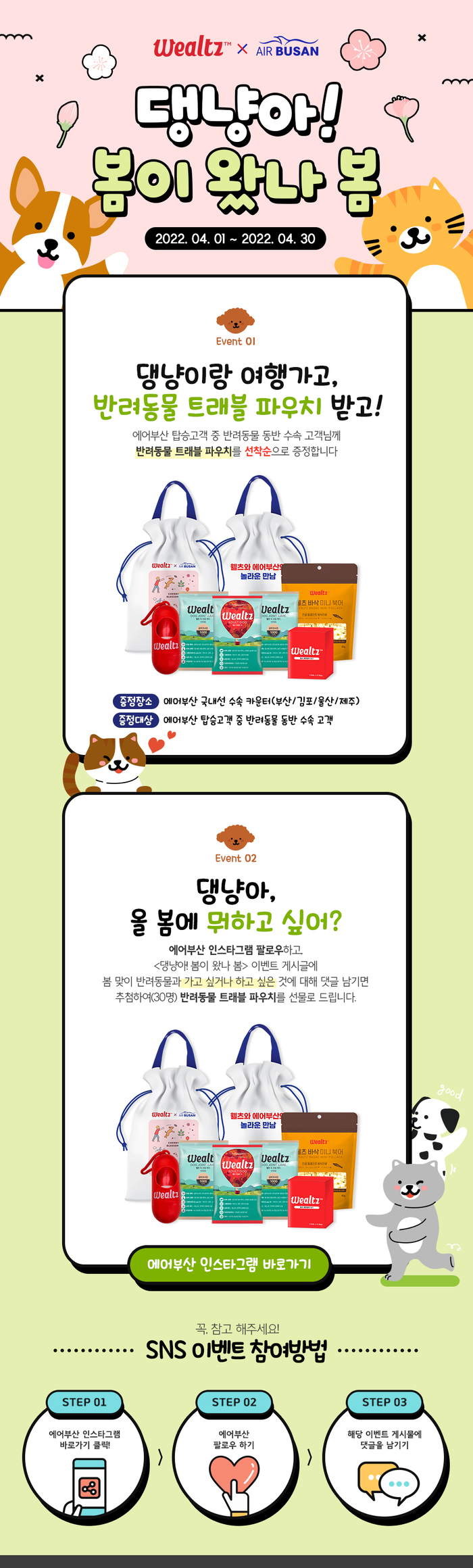 에어부산은 반려동물과의 동반 여행 심리를 높이기 위해 인스타그램 댓글 이벤트도 함께 진행한다. 이벤트 참여는 에어부산 공식 인스타그램 계정을 팔로우 한 후, 이벤트 관련 게시글에 반려동물과 가고 싶거나 하고 싶은 것에 대한 댓글을 남기면 된다. 댓글 작성자 중 추첨을 통해 30명에게 트래블 파우치를 제공한다. 자세한 내용은 에어부산 홈페이지 및 모바일 웹·앱 또는 에어부산 공식 인스타그램 계정(@airbusan)을 통해 확인할 수 있다.