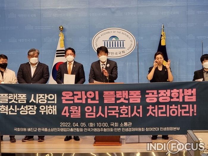 [인디포커스/김은해]정의당 배진교 의원은 5일 국회 소통관에서 플랫폼 시장의 혁신과 성장을 위한 ’온라인 플랫폼 공정화법‘의 4월 임시국회 처리와 플랫폼 사업자의 불공정거래행위를 넘어 독점적지위 남용 행위 근절을 위한 온라인 플랫폼 독점규제법 제정을 위한 기자회견을 진행하였다.