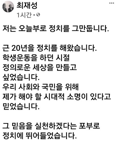 저는 오늘부로 정치를 그만둡니다. 근 20년을 정치를 해왔습니다. 학생운동을 하던 시절 정의로운 세상을 만들고 싶었습니다. 우리 사회와 국민을 위해 제가 해야 할 시대적 소명이 있다고 믿었습니다.
