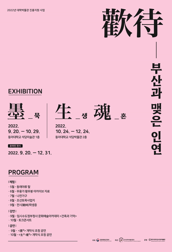 먼저 ‘墨(묵)’은 먹을 사용한 서예·서화를 중심으로 오는 9월 20일부터 동아대 석당미술관 1층 전시실에서 개최된다. ‘生(생)’은 일상생활 민속품, ‘魂(혼)’은 부산의 예술작가 작품을 오는 10월 24일부터 동아대 석당박물관 2층에서 선보인다.