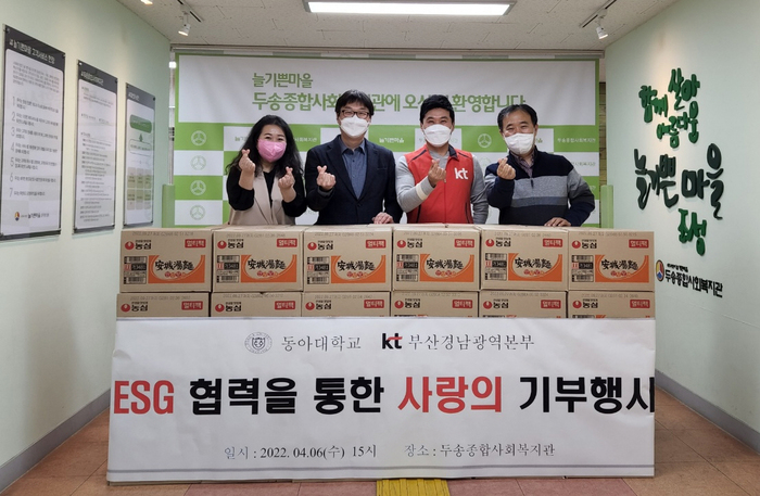 ▲ 최근 부산 사하구 다대동 두송종합사회복지관에서 열린 동아대와 KT부산경남광역본부의 ‘ESG 협력을 통한 사랑의 기부행사’ 참석자들이 기념촬영을 하고 있다. © 김중건