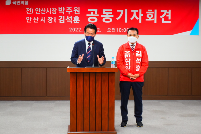 박주원 전 안산시장은 22일 10시 안산시의회에서 김석훈 안산시장선거 예비후보와 공동기자회견을 열고 김석훈 예비후보 지지를 선언했다.