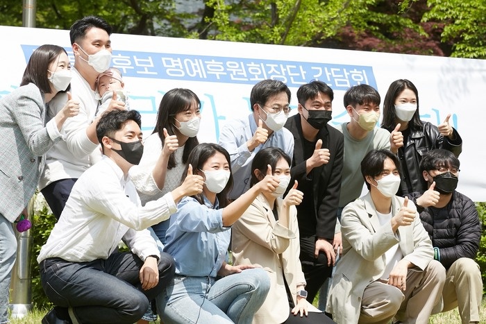 ▲ 민주당 김동연 후보가 '청년 명예후원회장단'과 함께하고 있다. 사진/김동연 후보 캠프 ©인디포커스