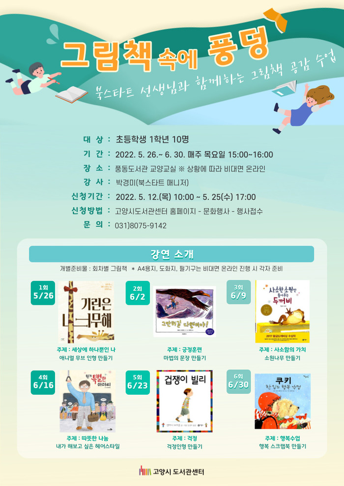 고양시 풍동도서관은 오는 26일(목)부터 6월 30일(목)까지 매주 목요일 총6회에 걸쳐 초등학생 1학년을 대상으로 온라인 어린이 독서클럽 ‘그림책 속으로 풍덩’을 진행한다.