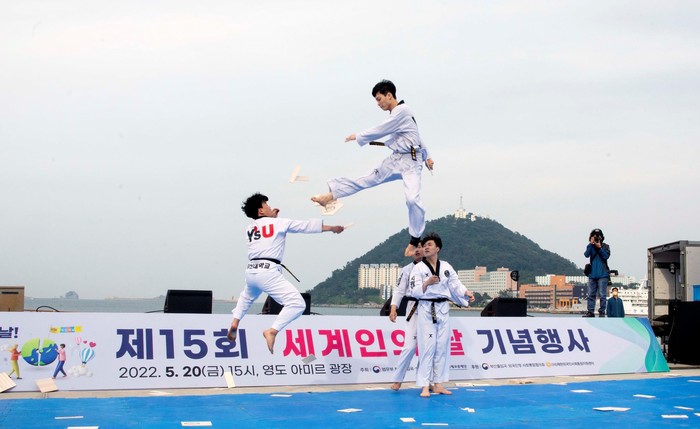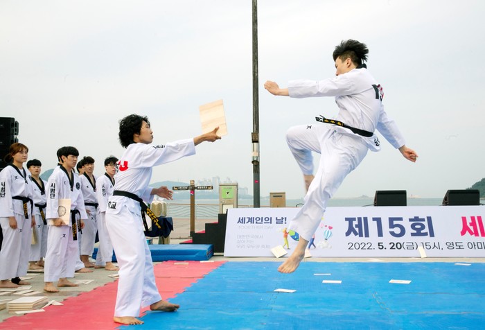 (인디포커스/김중건) 와이즈유 영산대학교(총장 부구욱) 창조인재대학 태권도학과가 지난 20일 오후 3시 부산 영도구 아미르공원에서 개최된 제15회 세계인의 날 기념행사에 초청돼 태권도 시범을 선보였다.