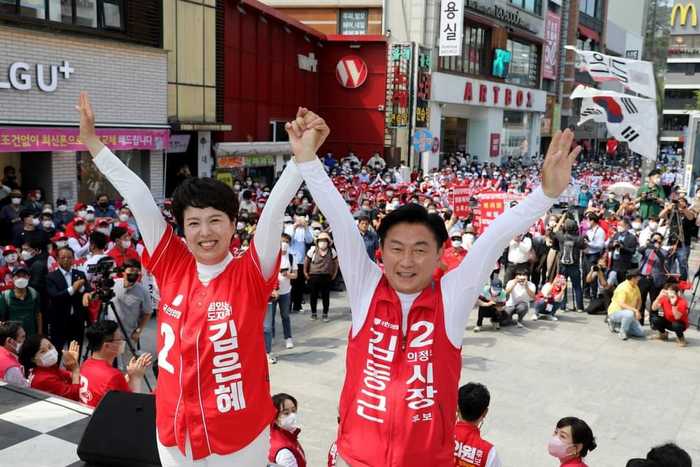 김은혜 경기도지사 후보와 김동근 의정부시장 후보가 선거 유세를 하고 있는 장면이다. 사진/인디포커스DB