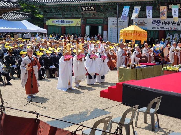 영축총림 양산 통도사가 18일 현충시설 지정 기념 호국영령위령재를 거행했다. 이날 위령재에는 조계종 성파 종정 스님과 통도사 현문 주지스님, 이준석 국민의힘 대표, 윤영석.민홍철 국회의원, 김일권 양산시장, 나동연 양산시장 당선인, 이상정 양산시의회 의장, 국방부 차관 임성현 부산보훈청장 등 정치인과 기관단체장 등이 참여했다.