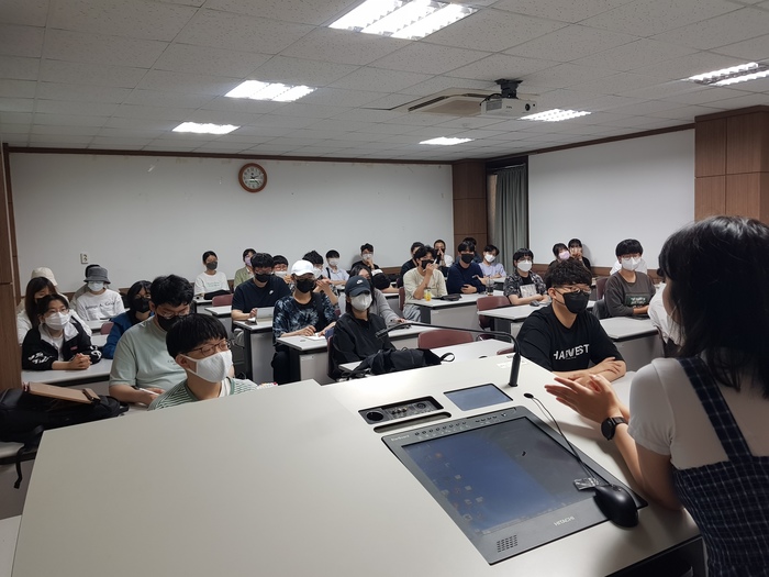 이날 강연에서 이 작가는 웹툰작가 데뷔 경험, 현역작가의 원고 작업 과정, 웹툰작가 실무, 즉석 질의응답 등을 진행해 재학생들의 큰 호응을 얻었다.