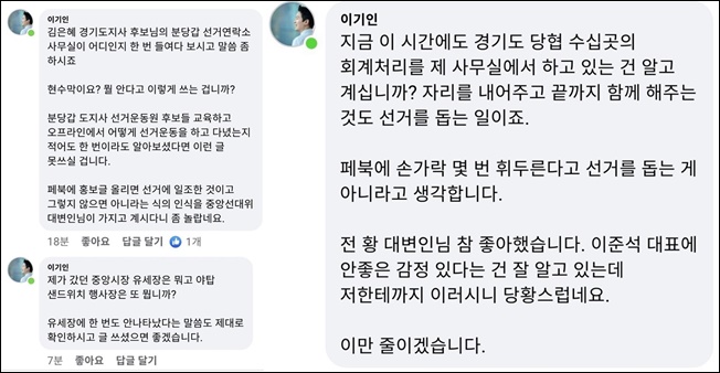 ▲ 황규환 전 대변인 페이스북 게시글에 올라온 이기인 도의원 당선자의 댓글. ©