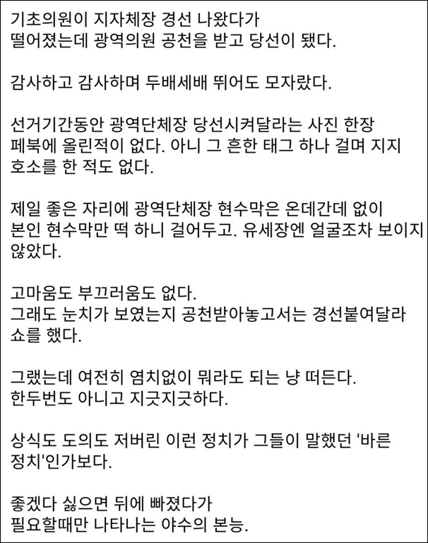 기초의원이 지자체장 경선 나왔다가 떨어졌는데