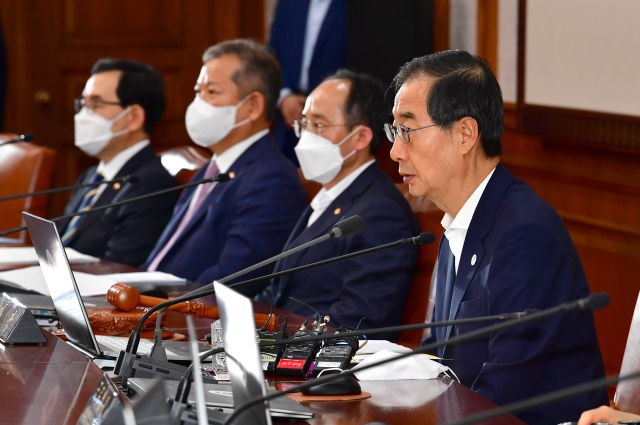 ▲ 한덕수 국무총리가 26일 정부서울청사에서 열린 국무회의에서 발언을 하고 있다. 오른쪽부터 한덕수 총리, 추경호 경제부총리 겸 기획재정부 장관, 이상민 행정안전부 장관. ©공동취재사진